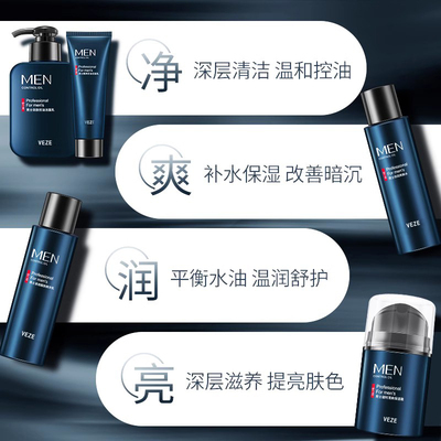 【洗面奶2瓶+爽肤水+精华乳+保湿霜】男神的保养秘籍~男士劲润酷爽5件套装!男人责任越大肌肤压力就越大,专为男士肌肤设计,全套出击,唤醒肌肤活力!