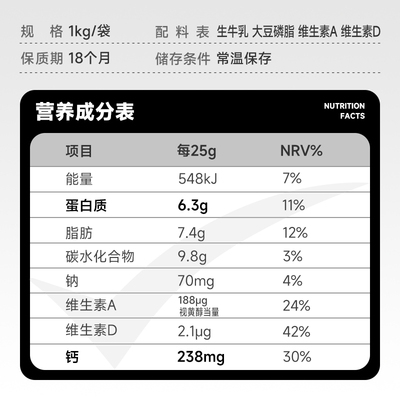 鲜奶直接喷粉,犹如喝鲜奶,高蛋白质,高钙,生牛乳配方,1小时生态圈,从牧场到工厂,冷热水均可冲泡。纽仕兰新西兰进口全脂高钙奶粉1kg