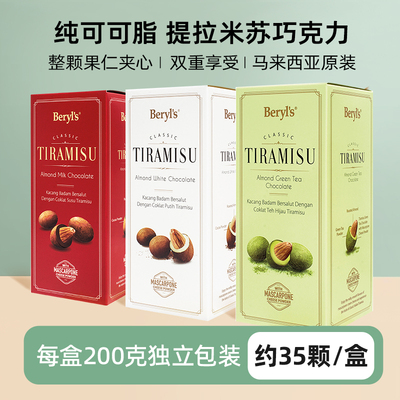 马来西亚进口Beryls倍乐思提拉米苏扁桃仁夹心巧克力,200g精致装超合适送礼!丝滑巧克力裹着香脆扁桃仁,提拉米苏风味醇厚不腻,颜值口感双在线,走亲访友拎上超有面儿!
