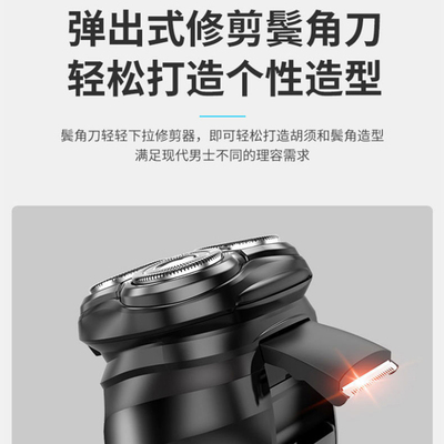 旋转三刀头+弹出式鬓刀+充电式设计!!高效剃须!轻松修剪个性造型!随时随地充电使用!!关键还有鼻毛器赠送!!