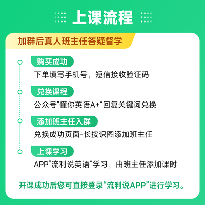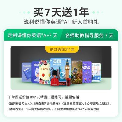 【新客礼金,即时专享】【官方立减12%,店铺新客减0.1元】【到手价0.66=12(原价)-1.5(官方立减)-9.5(限时立减)-0.24(淘金币)-0.1(新客)】【懂你英语A+7天课程】加服务群联系班主任送常用口语课!流利说1对1训练课程!个性化学习方案,AI老师因材施教,满足多样学习需求,零基础轻松上手,课程体系新升级,听说读写全覆盖,随时随地畅快学。限购1次,仅流利说新用户可兑换。