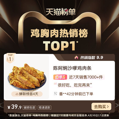【购物券加金币到手27.4】购买两袋!陈阿炳沙嗲风干鸡肉条来啦!鸡胸肉整块原切,无淀粉无添加,低温风干后丝丝分明超有嚼劲。浓郁沙嗲味渗透每一丝肉,越嚼越香,低脂高蛋白,追剧、办公解馋无负担,地道网红肉干闭眼冲!