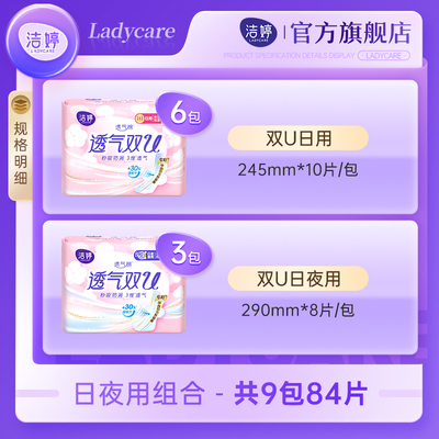【百补立减7元,叠加红包4元+淘金币,到手48元】日夜用组合共9包84片!透气双U系列!秒吸防漏,3维透气!日用,干爽透气不闷热,夜用量多不怕漏!