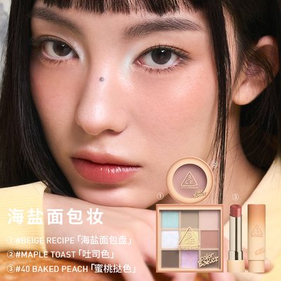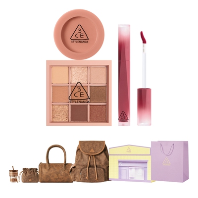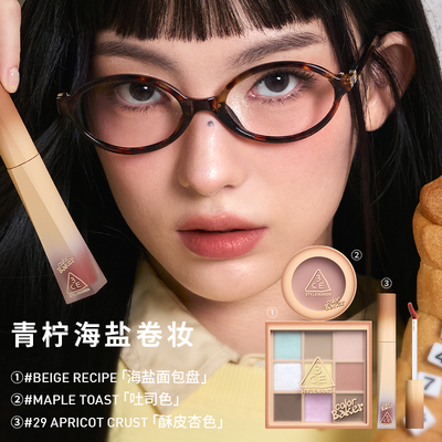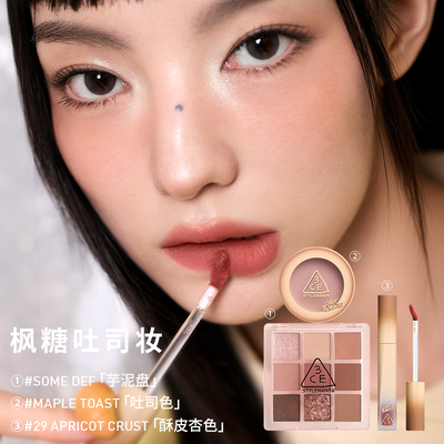 一盘解锁N种妆面!3CE彩妆礼盒,眼影涵盖哑光、细闪多种质地,唇釉有红棕、裸棕热门色号,搭配自然显色腮红,甜酷、温柔、元气风格随意切换。