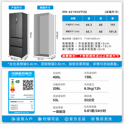 2日0-24点下单仅需3699,【新品】美的421超薄冰箱,法式多门设计,零嵌入更显高级,风冷一级能效,深冷保鲜更持久!品质之选!