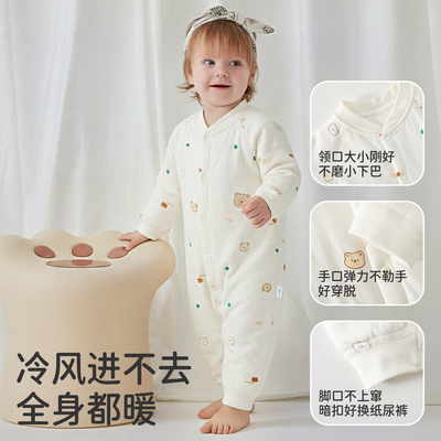 婧麒新生婴幼儿衣服秋冬保暖夹棉连体衣,小月龄宝宝无骨外出哈衣秋