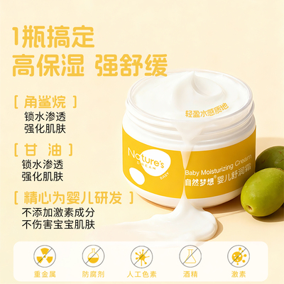 不油不腻,一抹水润四季呵护~精粹天然植物成分,修护改善宝宝脆弱肌肤,舒缓安抚。角鲨烷油脂,保湿锁水,持续水嫩。安心不添加,宝宝可全年使用,妈妈放心!