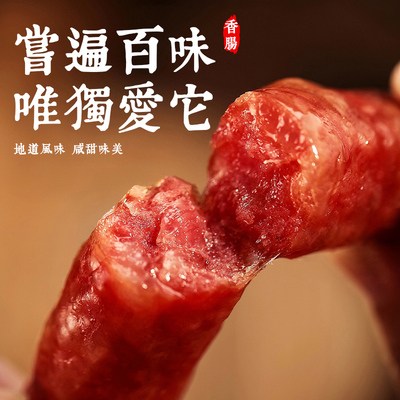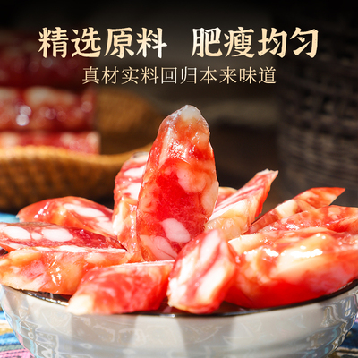 广式腊肠采用纯猪肉原材料,将瘦肉经粗绞、肥膘经切丁后,配以辅料,灌入天然肠衣再经晾晒而成。以传统腊味工艺制作,外形肥瘦相间,色泽红润。品尝起来腊香浓厚,糖酒风味,咸甜适中!!