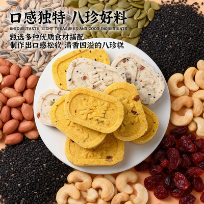 泓一!八珍糕年货礼盒,用料扎实,都是真材实料,软糯不甜腻,营养丰富,早上用来当早餐饱腹又健康!礼盒外箱以喜庆中国红为底,缀以烫金祥云与“八珍糕”字样,年味浓郁、端庄大气。