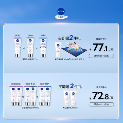 一半乳液深滋润,养出丝滑肌,全新妮维雅双管身体精华乳,温和有效解决肌肤粗糙问题。深入维稳,强韧屏障促进有效成分吸收。