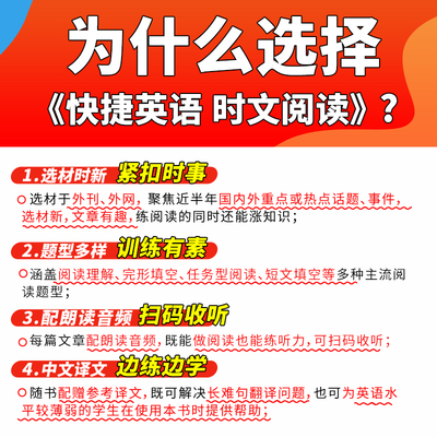 配朗读音频,精讲视频课。连续出版15年时文请认准快捷适用于各版本教材,阅读题源揭秘:阅读文章倾向取材于外刊、外网或是国内权威英文网站及报刊,即所谓“时文”,保证语言地道、语料真实。