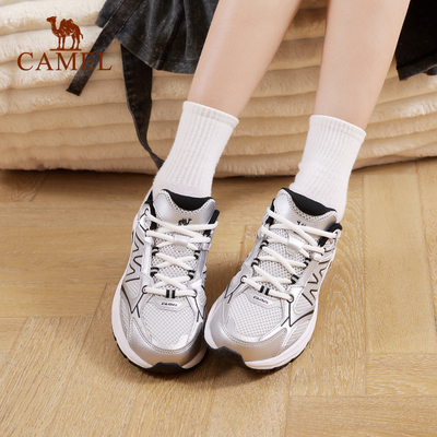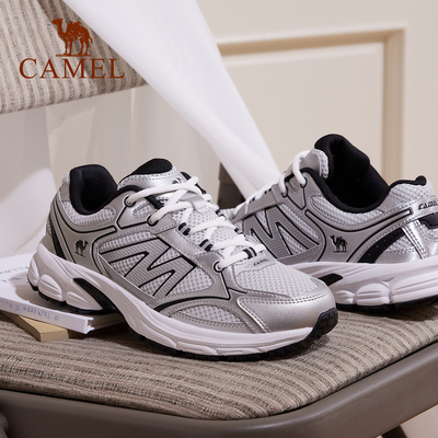 骆驼2025秋新款女款银色老爹鞋,耐磨网面设计,复古休闲风格,舒适缓震,适合日常穿搭和轻运动。