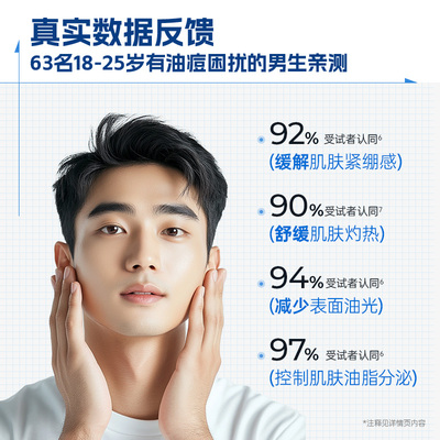 双重专利加持,实力控油,专为油痘肌男士研制给肌肤“消消火",舒缓褪红,高能修复