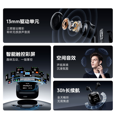 【超.级立减60元】thinkplus小彩盒智能触屏蓝牙耳机,舒适半入耳设计,贴合耳廓,久戴不痛。10项功能一触即达,接听电话、设置闹钟、找到耳机、音乐控制、语言切换、自定义音效、音量调节等丰富功能操控。