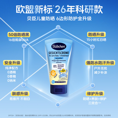 德国Bubchen贝臣儿童防晒霜,更安全,欧盟标准德国专研、更防晒,物化双重防护宝宝放肆玩、更好肤感,轻薄易推开安全不假白;50倍儿童防晒霜,双重防晒科技]物理+化学协同防护~~