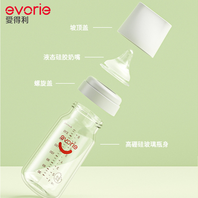 evorie爱得利大宝宝奶瓶0-6个月,防呛水设计+玻璃防胀气款,安全耐用,呵护宝宝娇嫩肠胃,