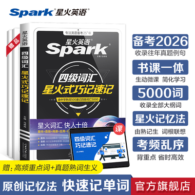 星火英语四级通关+词汇巧记速记,19套真题+预测,词汇\语法册,视频逐题讲,备考2026含考试真题例句,5000词收录全部大纲词,星火记忆法,由熟记生词根联想,考频乱序,背重点,省时高效,全彩漫画,彩色印刷,漫画图解!