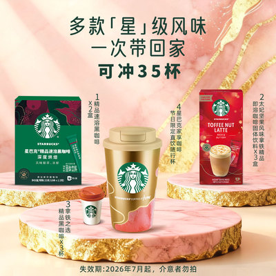 内含:深度烘焙速溶咖啡*2盒+太妃坚果风味拿铁*3盒+随星杯尝鲜装*3杯+鎏金岩彩随行杯*1!星巴克鎏金杯就价值100多了,咖啡相当于白送!!!失效期:2026年7月起!山姆同款星巴克速溶咖啡美式礼盒,节日限定鎏金包装,内含多款经典口味,适合健身、办公提神,品质与颜值兼具,送礼自用都超值!