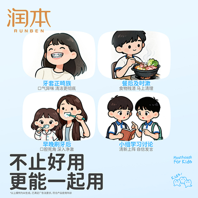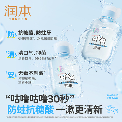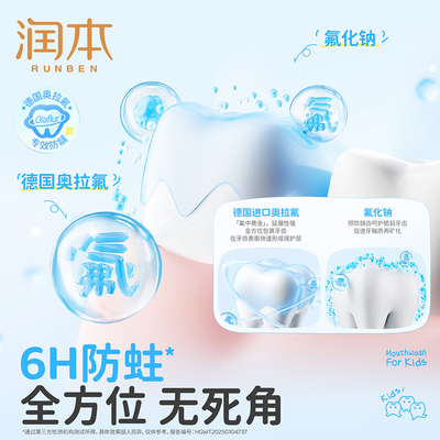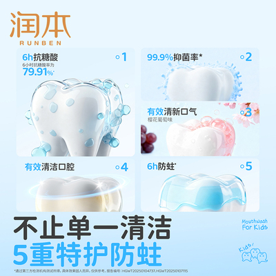 【限时券1,叠消费券极到手33.95/2=16.9/瓶】润本儿童漱口水6-12岁专用,含氟配方,温和不辣口,有效清洁口腔、护齿抗糖酸,预防蛀牙,守护孩子牙齿健康!