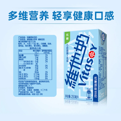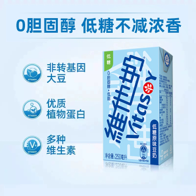 维他奶低糖原味豆奶250ml*24盒,整箱囤货装!经典原味浓郁豆香,低糖更健康,减少糖分添加,畅饮无负担。植物蛋白丰富,适合乳糖不耐受人群,日常饮用好选择!